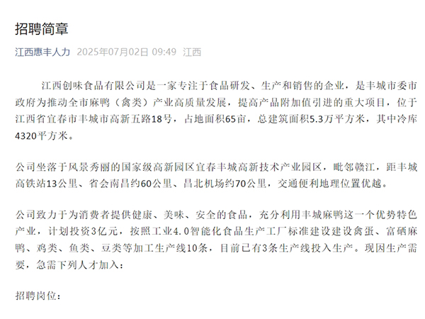 江西創(chuàng)味食品有限公司是一家專注于食品研發(fā)、生產(chǎn)和銷售的企業(yè),是豐城市委市政府為推動(dòng)全市麻鴨(禽類)產(chǎn)業(yè)高質(zhì)量發(fā)展,提高產(chǎn)品附加值引進(jìn)的重大項(xiàng)目,位于江西省宜春市豐城市高新五路18號,占地面積65畝,總建筑面積5.3萬平方米,其中冷庫4320平方米。公司坐落于風(fēng)...